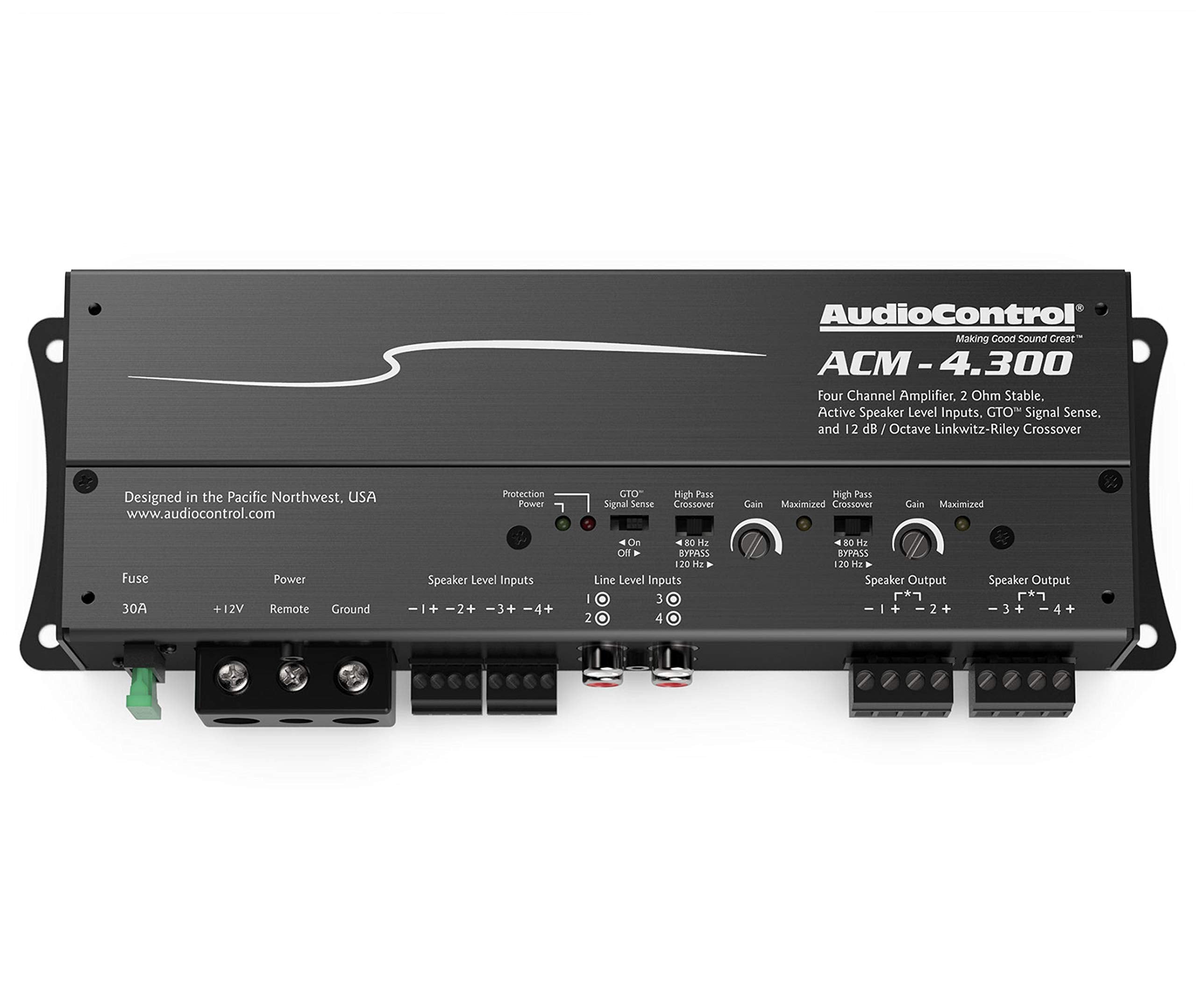 Power makes good speakers sound great, but where to put an amp in your smaller vehicle? AudioControl comes to the rescue with their compact ACM-4.300 4-channel amp, which delivers 50 watts RMS per channel — perfect for two sets of speakers. This tiny, hand-size amplifier will fit almost anywhere in almost any kind of vehicle, improving the impact and clarity of your music. Even better, it features high-level inputs with signal-sensing turn-on, so it'll work with almost any stereo system, even one using a factory radio.