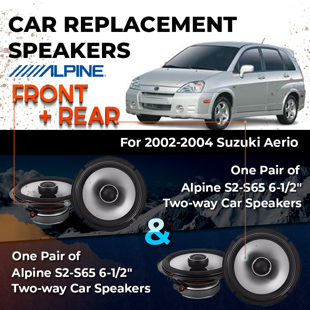 CAR REPLACEMENT SPEAKER PACKAGE FOR 2002-2004 for Suzuki Aerio hatchbackVEHICLES THIS PACKAGE INCLUDES THE FOLLOWING: Alpine S2-S65...