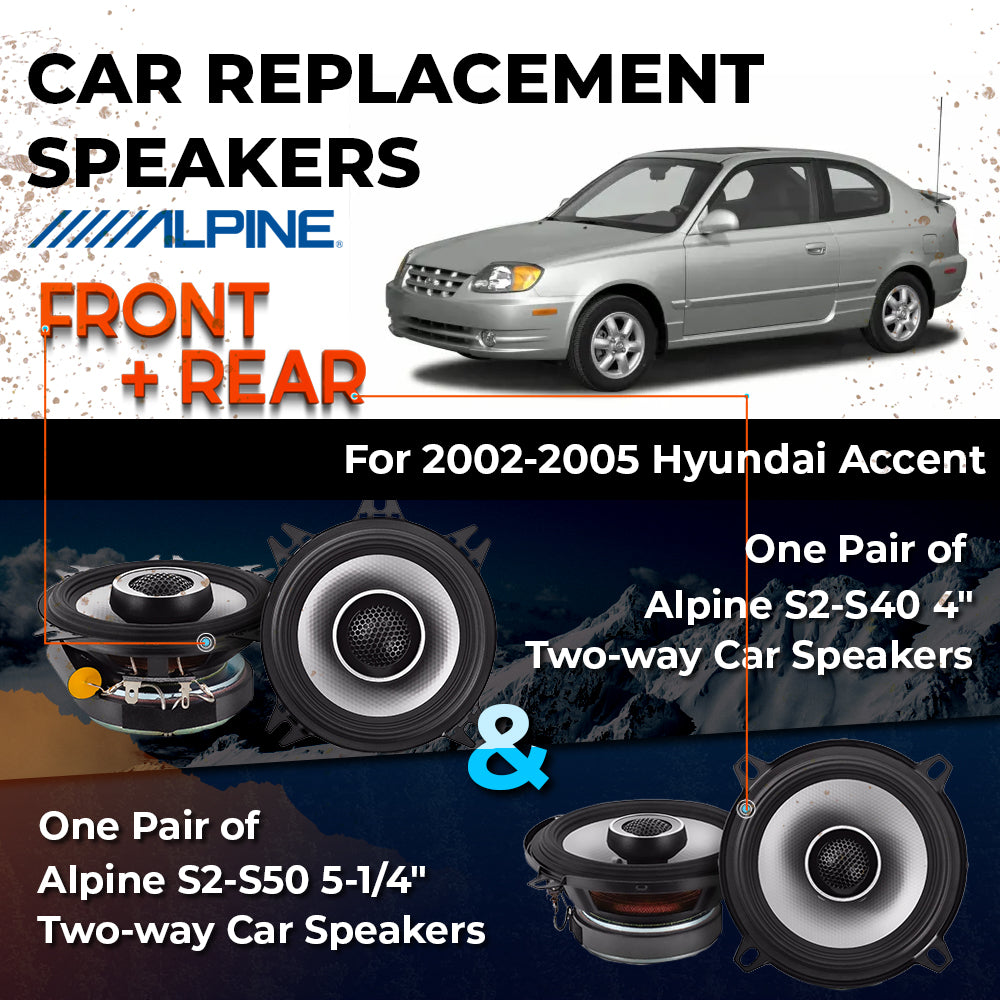 CAR REPLACEMENT SPEAKER PACKAGE FOR 2002-2005 for Hyundai Accent VEHICLES THIS PACKAGE INCLUDES THE FOLLOWING: Alpine S2-S40...