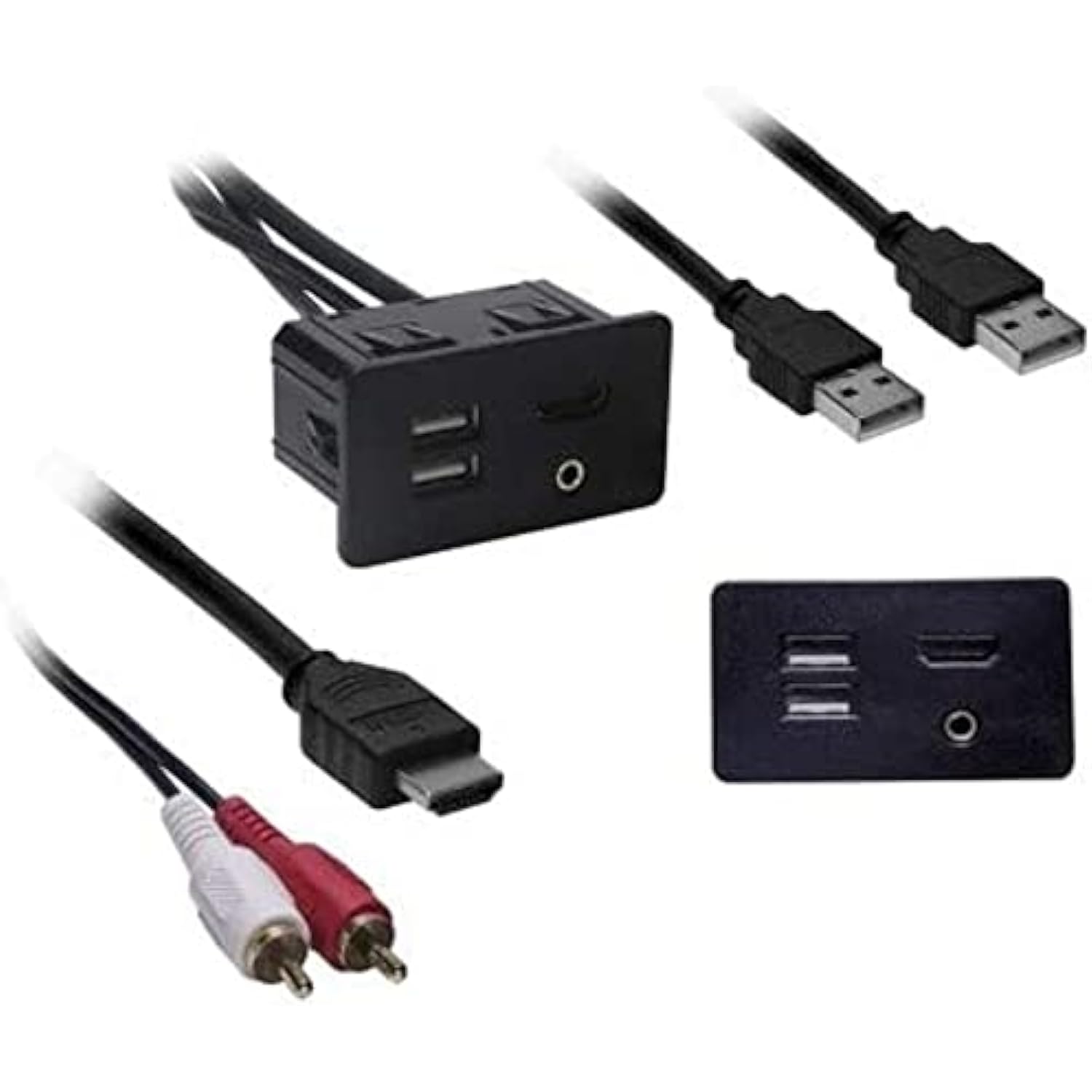 Unit includes: HDMI, Dual USB and 3.5mm Auxiliary input jack panel and extension cable