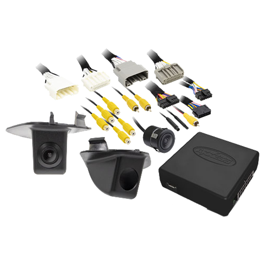 This camera kit includes two side mirror pods and cameras providing a 170-degree field of view and Axxess AX-ADDCAM interface and wiring. The AX-ADDCAM camera switching interface allows integration for up to four different cameras to function automatically for parking assistance with four CAN activated camera inputs to the factory radio.