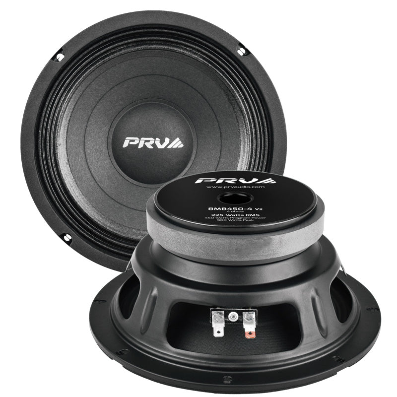 The 8MB450 v2, 8? PRV Audio Pro Audio Midbass Woofer offers smooth lower response through a punchy mid bass range and the frequency response that takes your applications smoothly through the 7,500 Hz range. The 2? voice coil, durable spider suspension and the woven surround all supported by the sturdy steel basket ensures its ability to withstand long hours of operation without compromising efficiency of the speaker. A thick, yet light rigid cone ensures accurate response and power handling.