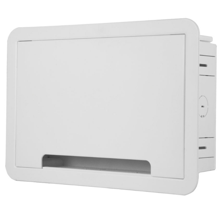 The 9-in TV media in-wall box is ideal for concealing and organizing media devices and power in wall to create a sleek, finished look. The perfect solution directly behind any wall mounted TV to store streaming devices like Apple TV, Roku, Amazon Fire TV, network switches and more. Constructed of Wi-Fi transparent material to manage wireless components with cable knockouts to help organize cables. Includes cover, trim ring and drywall clips, and cutting template for easy installation.